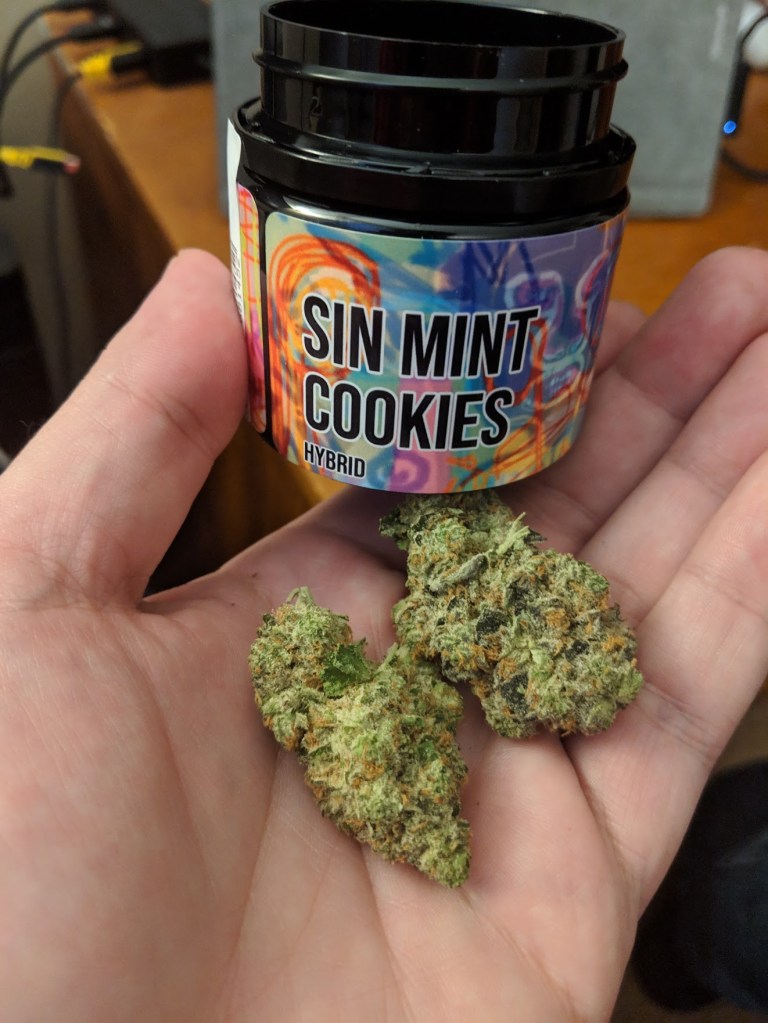Sin Mint Cookies from Pearl Pharma via MMD Hollywood on 1/24/19. THC Tested out at 20.2%. Would have been $55 plus tax but I got it for $20 due to MMD Hollywoods first time patient deal. I’ve had my eye on Pearl Pharma for a while now with all of the positive buzz I’ve heard revolving around Sin Mint Cookies and Double Cup. As with a lot of premium brands I found the ticket a bit difficult to stomach so I was fortunate to catch a break with MMD Hollywoods first time patient deal. While the look was impressive, the sample didn’t jump out at me like some of the other herb they had on display, but on hype alone I pressed forward with the Sin Mint Cookies. The look on these buds is the real winner.