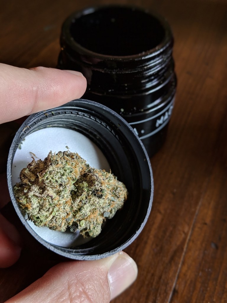Sunset MAC from L.A.Made via Peace of Green on 2/24/19. Unsure of THC% as it’s not on the packaging. Purchased for $30 plus tax. I was lucky enough to pop into the shop on the day Sunset MAC had just arrived so I knew I had to grab an eighth and I definitely don’t regret it. This flower is just plain beautiful, I had to get a video of it shinning in the sun to share it before I smoked it all away. Mostly light green with hints of purple here and there, the triches really steal the show as they are abundant and drill all the way to the stem. I found myself being constantly impressed as I ripped pieces off this main nug and it revealed the treasure trove of diamonds that existed just below the surface.