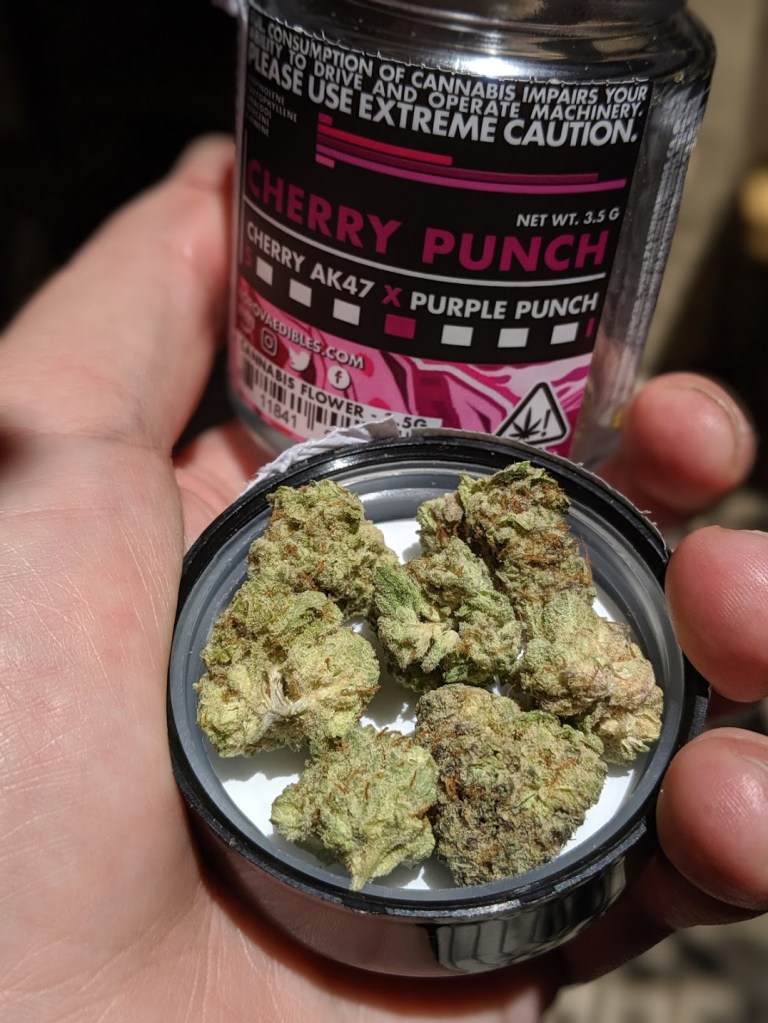 Cherry Punch from Korova via The 10 Spot on 6/1/19. THC tested out to 21.77% total. Purchased for $50 plus tax. Purple Punch tends to have a lot of bag appeal, so when I saw Korova (who consistently puts out fire) put out a cross with Cherry AK-47, I decided to see if it’s bark was as big as it’s bite. The look definitely doesn’t disappoint here. There’s a nice frosting of triches giving the nugs that sort of hazy shine which slightly obscures the tightly wound light greens and purples that comprise the majority of the surface area. The odd brownish red hair pops out of the hair here and there looking like a ginger teens unkept uneven attempt at a mustache.