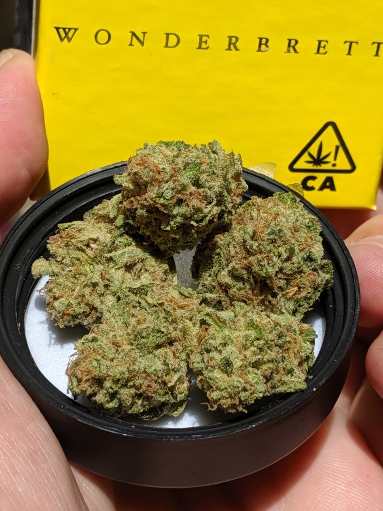 Lemon Citrine from Wonderbrett via Caña Farms on 7/17/19. THC tested out to 22.07%. Purchased for $55 plus tax minus 20% for the early bird special. The last time I came across WonderBrett it was in the pre-prop 64 days when most nug was still sold out of mason jars and pre-packaged 8ths were a rarity. The packaging on their Tangieland was awesome, and looking at the current recreational marketplace, it was a brilliant move that was ahead of its time. That tradition continues today with their current offering, a nice looking watch style box, a sleek black opaque jar within. The look of this particular batch of Lemon Citrine is itself fairly ho-hum in comparison to it’s illustrious packaging. Don’t get me wrong, it’s a very nice looking herb, it just doesn’t give me that visceral gut reaction when I see it like lot of top shelf does these days. The nugs are a nice light green with the occasional blotch of dark and light orange hairs manifesting themselves in patches sporadically across the well triched out surface.