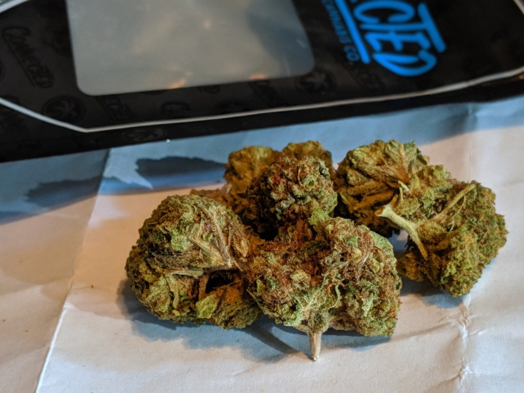 Guava from Connected California via Connected Santa Ana on 7/9/19. THC tested out to 21.66% Total. Purchased for $28 plus tax. The smell out of the bag is fruity and sweet which is no surprise given the name Guava. The nugs themselves are dark green little boulder looking shrubs that are fairly dense but still have the slightest give to the squeeze. There are dark orange hairs that seem nearly vacuum sealed to the surface with the way they cling to it.