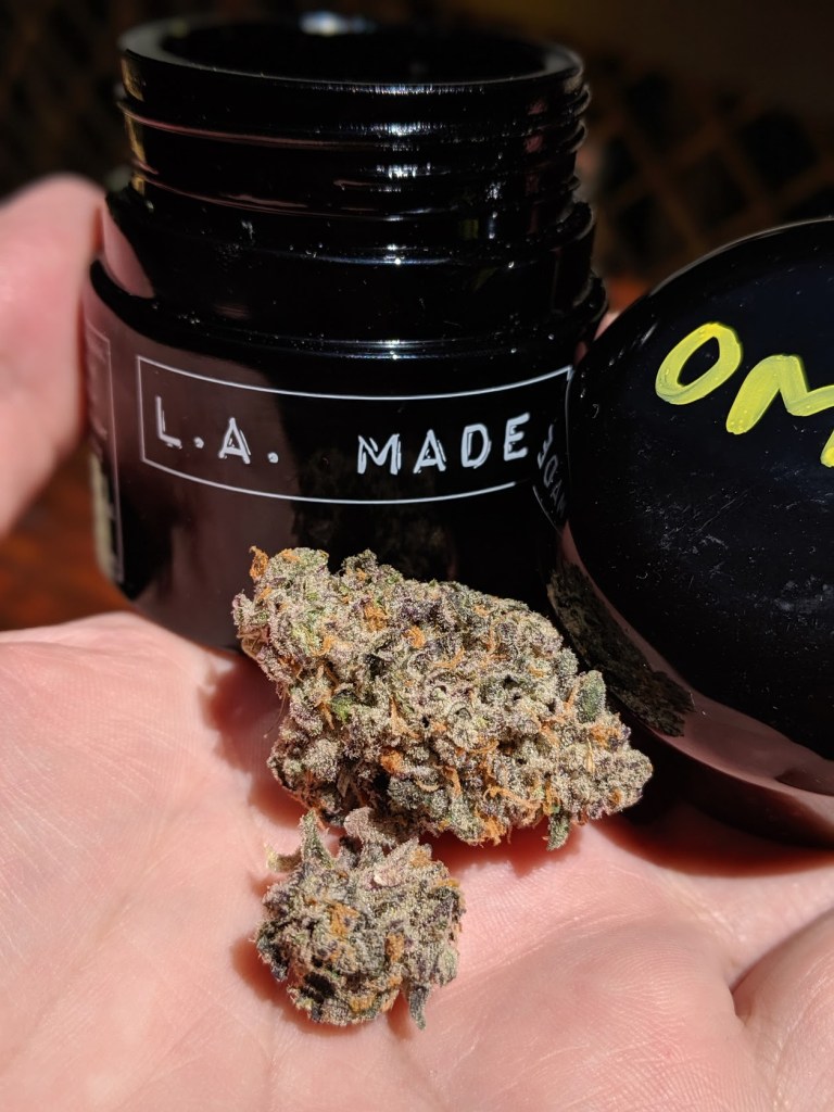 The nose out of the jar is straight oranges, if you were blindfoldeded and asked to ID the smell within 5 second you’d think nothing else but oranges, but as you take your time with the scent it reveals these beautiful light floral and mint notes that linger delicately in the background. On the finger grind, the smell remains essentially the same but kicks it up a notch with the mint notes getting subtly louder. The inhale is smooth and I’m picking up on some spice in the exhale. The headchange comes on fairly quick, and while it doesn’t leave you stunned, you will feel just a bit loopy. You can focus but you may find yourself facing the occasional cognitive hiccup. You can wake and bake on this strain just fine but I’d say it’s best paired with a cup of strong coffee. This is fantastic smoke for getting outdoors or doing some city sight seeing, you’re present enough to enjoy the moment but best not to dive too deeply into any given topic, or you might find your mind wandering to the next shiny object in front of you. If I had to find a criticism of Orange MAC it would be that it lacks staying power and will have you reaching back for another bowl to smoke in 30 or so minutes. That said this is a beautiful MAC cross at an amazing ticket and something I wouldn’t mind keeping in my headstash at all times. Another banger by LA Made , Capulator and the Peace of Green team, awesome work!