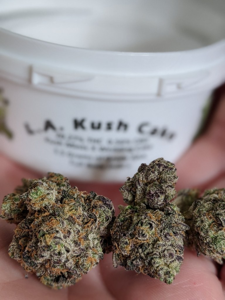 LA Kush Cake from Indoor Organic Gardens via Gulf Coast Haze Collective on 10/31/19. THC tested out to 20.27%. Acquired for a donation of $50. Another beautiful batch of flower from the current collection of IOG making the rounds. These semi dense buds are a deep rich purple with lime green accents contrasted against fireplace orange pistils encrusted in stunning triches that give off a diamond-like shine.