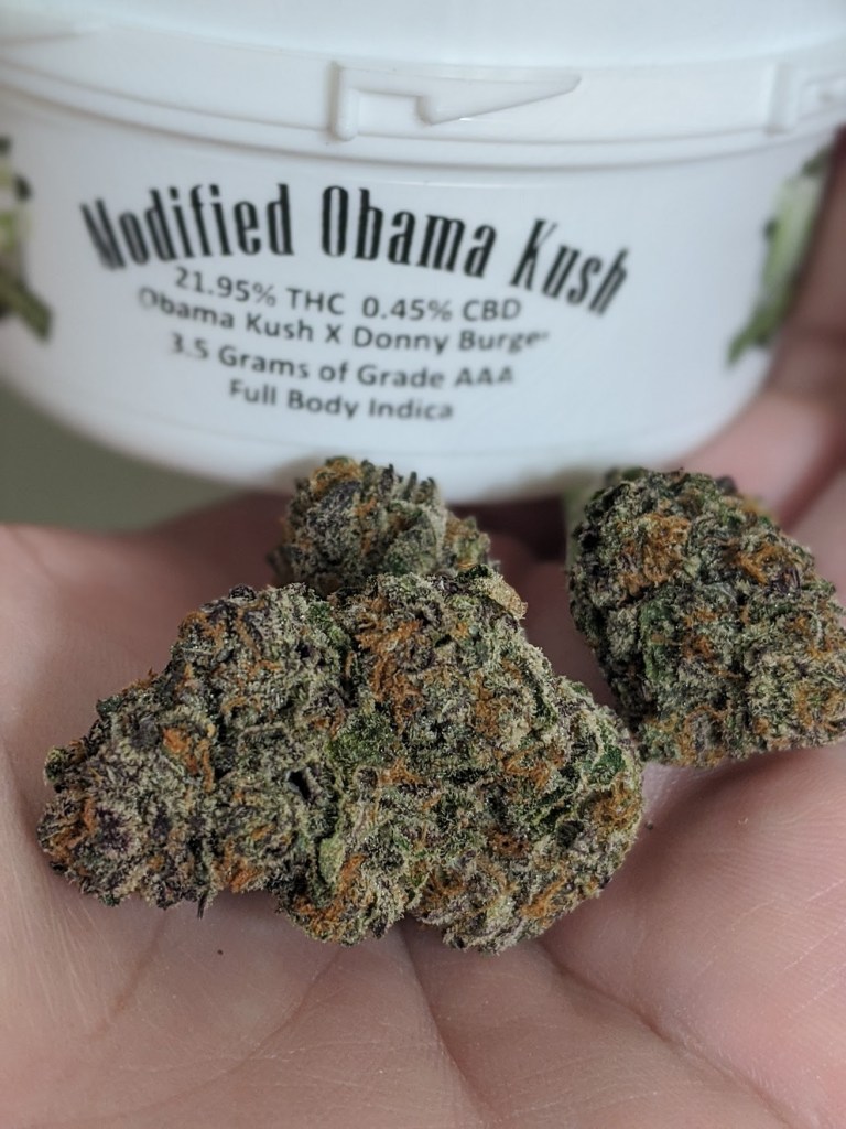 Modified Obama Kush from Indoor Organic Gardens via Gulf Coast Haze Collective on 10/31/19. THC tested out to 21.95%. Acquired for a donation of $50. The final review from this last round of IOG bangers. These semi-dense buds are a deep aubergine with pumpkin pie orange hairs and patches of light green surface area that almost go unnoticed due to the camouflage afforded them by an impressively thick layer of triches.
