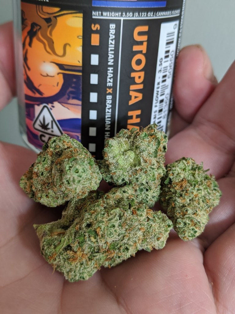 Utopia Haze from Korova via The Spot on 11/16/19. THC tested out to 28.26%. Purchased for $50 plus tax. I’m a sucker for a good sativa and a limited drop so when I saw that The Spot had some of this Utopia Haze I popped down there asap to get my hands on some and was lucky enough to get the second to last jar in the shop. According to Korova, Utopia Haze is “the result from generations of backcrossing and selection from a single prized Brazilian landrace that was crossed with itself without contact or alteration with different genetics”. That would make sense to me as the look, smell, and effect are all very unique. The buds are semi-airy but have the appearance of pure density. The buds are a bright mint green and one of the first things that catches the eye is how strangely porous it appears. There are these small spaces that dot the surface that look very similar to the holes in a pumice stone. The look is further complimented by the occasional flare up of fireplace orange hairs and a generous layer of frosty white triches.