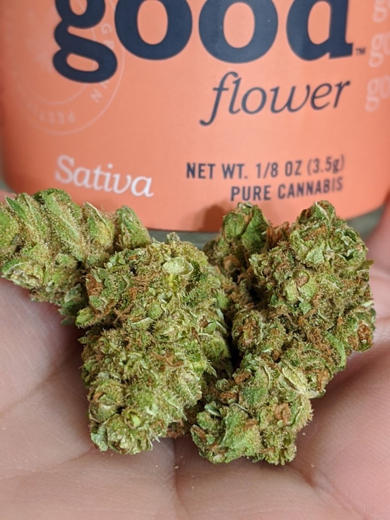 The herb is very crispy, my guess is that moisture pack was added to combat this, but it was not very helpful. The nose out of the jar is musty in a dusty back of your closet kind of way. The smell strikes me as being similar to clothes that have been put away for many years and are now just getting exposed to fresh air for the first time in a while. There’s this acrid smell that’s also that’s hard to pin down, it’s a little cheesy and a little citrusy, but overall just comes off as unpleasant. When breaking the nug, there’s a bit of a sweetness that emerges, but it’s mostly that same musty cheese scent. On the finger grind I notice the mustiness sort of widens out and you get a bit more of the sweet and citrus but it’s not all that powerful. I’d say it comes off as a really muted spicy lemon. The inhale is little harsh on the throat and I catch a flavor that reminds me of a pineapple rind but in an extremely faint sort of way. On the exhale I pick up on a slight sweetness with a bit of earthiness in the background. The headchange is weak and frankly frustrating. I smoked bowl after bowl and it would almost get me where I wanted to be but not quite. It felt like climbing an icy steep driveway, struggling as you’re almost to the top, then losing your footing and sliding all the way back down to the bottom. I’d describe this as Grandpa Strength. If you know an older person who used to smoke back in the day but finds that strains today are just too powerful this would be perfect for them. While I would recommend it for someone like that, I can’t say I would recommend it for anyone else, even at the discounted rate. Sorry Good Flower, as a sativa fan and a Super Silver Haze lover, this one was a total miss for me.