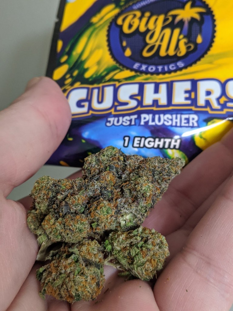 Gushers from Big Al’s Exotics via Gulf Coast Haze Collective on 11/26/19. No Testing info listed on the bag. Acquired for a donation of $45. When Prop 64 went into law, one of the first strains I naively tried to order from a Bay Area delivery service was Big Al’s Gushers due to the hype I saw on instagram at the time, so I was stoked to finally get my hands on some. These super dense buds run the gamut on the entire color spectrum. Deep raisin purples transition to pickle greens chased by even lighter shades of shamrock green, all accompanied by beautiful bursts of fiery orange pistils, heavily coated in large dewy looking triches.