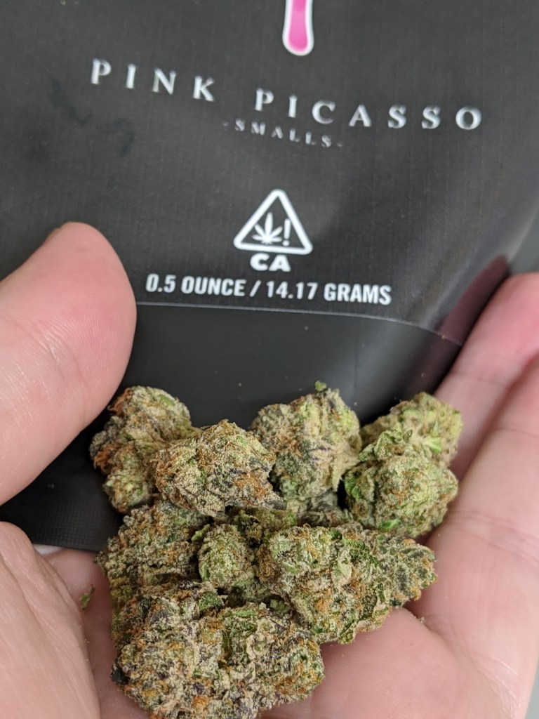 Pink Picasso from Wonderbrett via Secret Sesh on 12/07/19. THC tested out to 25.57%. Purchased 14 grams for $100. When I started my Secret Sesh shopping spree my first stop was the Wonderbrett booth and they really made it challenging to hold on to my money as the ticket they were offering was nearly unheard of in the recreational market for this level of quality. While the bag is labeled “smalls” the nugs looked pretty much exactly the same size as what you’d come across in any given top shelf jar at any given shop. These semi dense buds have an intense camouflage pattern of light and dark greens coupled with rich deep purples and sporadic bunches of burnt orange pistils all iced over with a healthy layer of yellowing triches.
