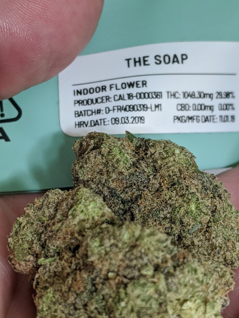 The Soap from Minntz via Cookies Maywood on 1/22/2020. THC tested out to 29.98%. Picked up for $60 plus tax (minus 20% happy hour discount). The Soap is the latest strain to ride the hype train, so when I found myself cruising through East LA at the start of Cookies Maywood happy hour, I decided to stop in and cop a batch for review. Truth be told the look of these buds are very disappointing. Two boulder-like nugs comprised the entirety of the bag, the have zero squeeze. to the touch, and frankly they feel like pre-prop 64 PGR weed. The surface is a patch work of lime and forest greens with deep purples, the occasional brownish red pistil, and a decent frosting of triches that seem slightly off to the naked eye. When you zoom in it looks like they may have been treated some what roughly, looking like someone took a micro weed whacker to the outside, as it appears there are many headless trichome stalks.
