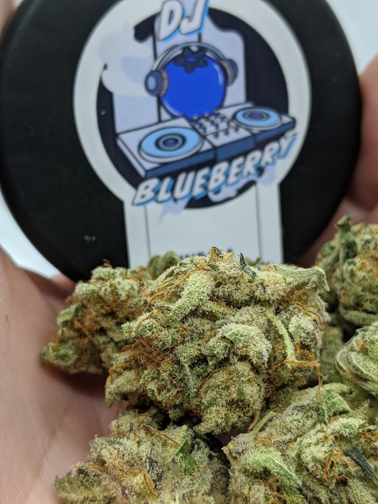 DJ Blueberry from The Cure Company via City Compassionate Caregivers on 1/6/2020. THC tested out to 23.64%. This was gifted to me but it goes for $30 plus tax on the CCC menu when available. I have heard of DSB for years but I honestly can’t recall ever trying it so I was stoked to see this DJ Blueberry made it’s way into my sample pack. These fluffy buds are a camouflage patchwork of lime and forest greens with the occasional rash of aubergine, brownish orange pistils, and a healthy layer of white and yellowing triches.