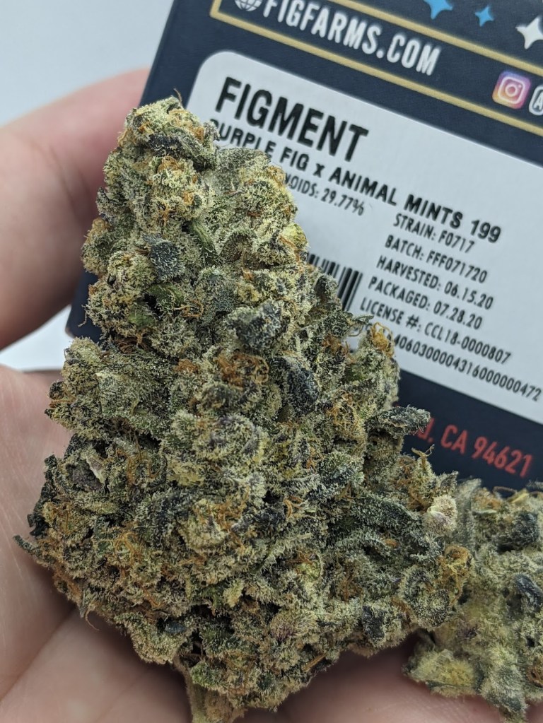 The nose out of the jar is a musty floral and eraser rubber with an acrid yet semi sweet lean and a hint of freshness. Busting open the bud, a sweet fruit emerges that’s really hard to pin down, but hits my senses as an overall fruit punch with a grape lean and herbaceous freshness. Grinding it down by hand, I get a sense for how incredibly sticky it is, evidenced even further when ripping it apart as it spins some of the longest trich webs I’ve ever seen. It leaves a musty cream on the fingertips, while the grinds themselves have a beautiful subtle sweetness that comes off equal parts fruity and floral, and when taken together as a whole smell like a mild watermelon scented candle. The dry pull on the joint has floral sugar sweetness with a mentholated edge. The inhale is smooth, and on the bong I get toasted marshmallow and graham cracker, whereas the joint is more of a general toasted sweetness. On the exhale, that musty sweet rubber makes a come back on the bong, but the joint is more of a musty floral with a muted savory edge. Cross checking the flavor on my MV1 from Ghost Vapes at 170c, I get a touch of cooling on the tongue with a mild floral tinge and a piney aftertaste, and at 185c that same minor cooling effect is there but the floral is a bit less defined. The headchange comes on strong and will throw you for a bit of a spacy loop. In my notes I described it as “being in a constant state of feeling like I forgot something”, as I’d find myself going on autopilot mid-task frequently, to snap back to reality a short while later with only a vague notion of what I was doing just moments before. On a joint walk I found it put a pep in my step while I tangled with a slight bout of paranoia, keeping my eyes on the horizon for cops or parents with kids, or anyone else that might be offended by the pungent aura that announced my presence to the neighborhood. As time passed, a much more chill vibe set in as my body relaxed and felt just a touch floaty, and with that spacy aspect now in full effect the second half of the walk seemed much quicker than the first. I really dug this batch of Figment, and if I had to pick between the two, I think I like it just a touch more than I did the Holy Moly! which is an impressive feat. The truth is in my personal experience, each Fig Farms strain I’ve tried is better than the last, and it’s no doubt some of the most immaculate weed on the recreational market. I can’t wait to get my hands on more. Great work once again Fig Farms, you guys are amazing at what you do, keep up the fantastic work!