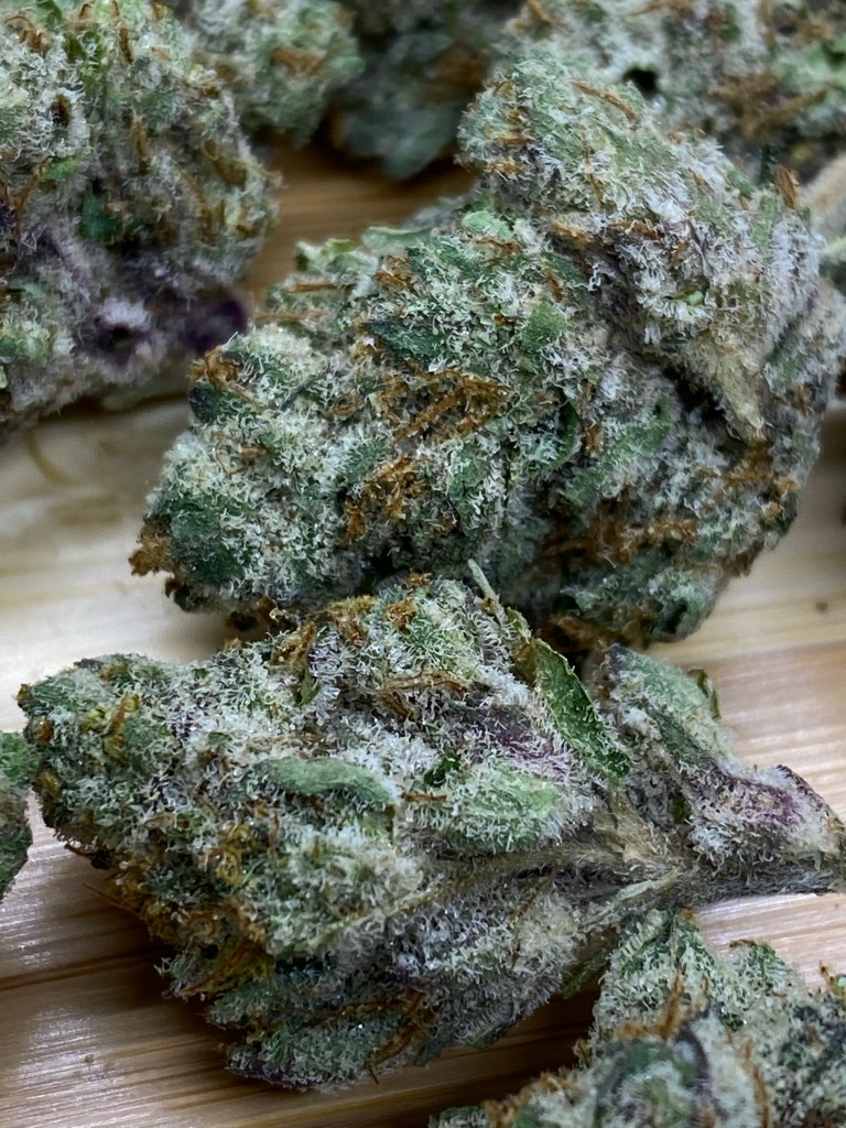 When I saw this drop I got pretty excited and grabbed one for me and a buddy. The looks on this one are pretty nice. Definitely some purples and lime peel green going on and so many trichomes that it really changes the color of the flowers to almost a steel blue or grey. All the nugs were pretty small and made it a slightly obnoxious when breaking apart but overall the structure was workable.