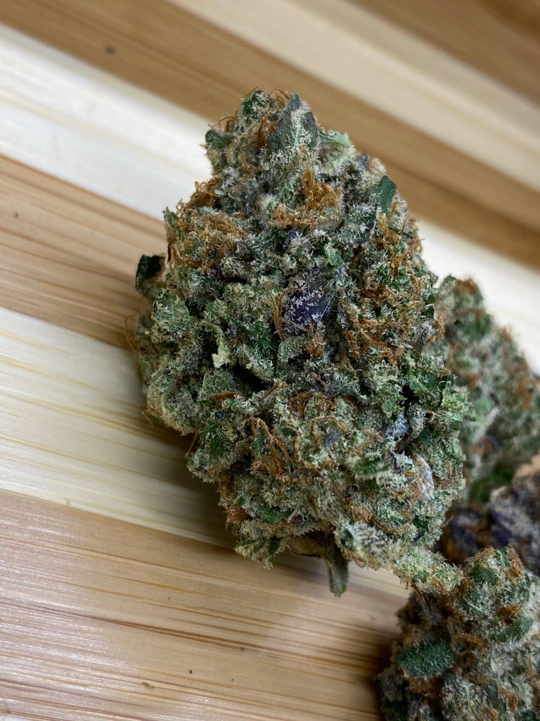 This is a very popular strain and I definitely get why. In the looks department she’s quite pretty. With dark almost black purples and some darker hunter green leaves and an orange red for the pistils that looks like rust this flower has some colors that really pop to the eye. This flower felt like it was cured ok and the structure was very easy to work with.