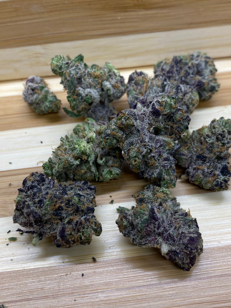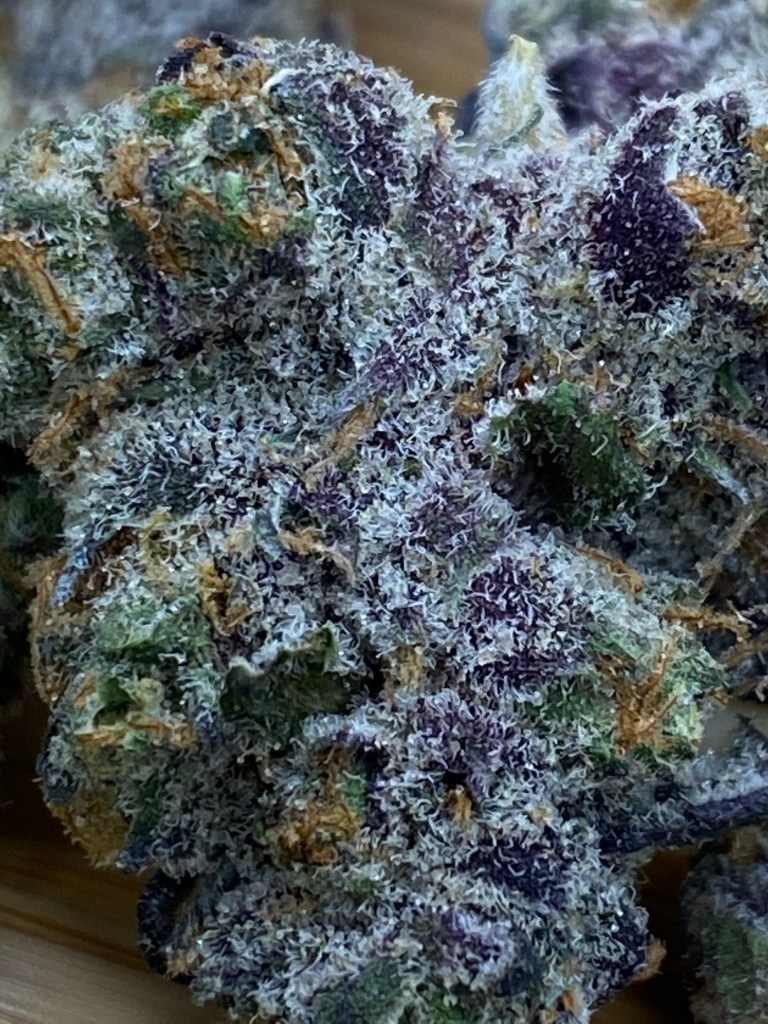 So I started to see this brand pop up with some interesting strain names and this one definitely peeked my interest. Something that sounds really cool but not sure of how much of an effect it would have is the fact that they claim it’s cultivated by the fresh snow melt of Mt. Shasta. Sounds super cool and refreshing. This flower was quite pretty and really had nice contrasting purples and greens that really made the colors pop. Rust colored pistils all about. Really heavy coating of trichomes that really make this flower appetizing.