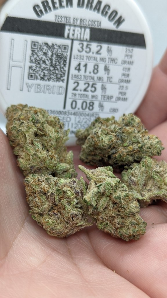 Feria from Green Dragon via Catalyst Downtown Long Beach on 2/19/2022. THC tested out to 35.2%. Normally goes for $48 out the door but I was able to scoop it for 40% that off due to a 3rd time visit coupon I was using. I found myself at Catalyst in Downtown Long Beach with an awesome 3rd time visit discount to use and I was determined to make the most of it. As of late, a few people had mentioned Feria to me as a flower they’d like to see reviewed, and being a fan of Green Dragon myself, when I saw this on the menu it was a no brainer.