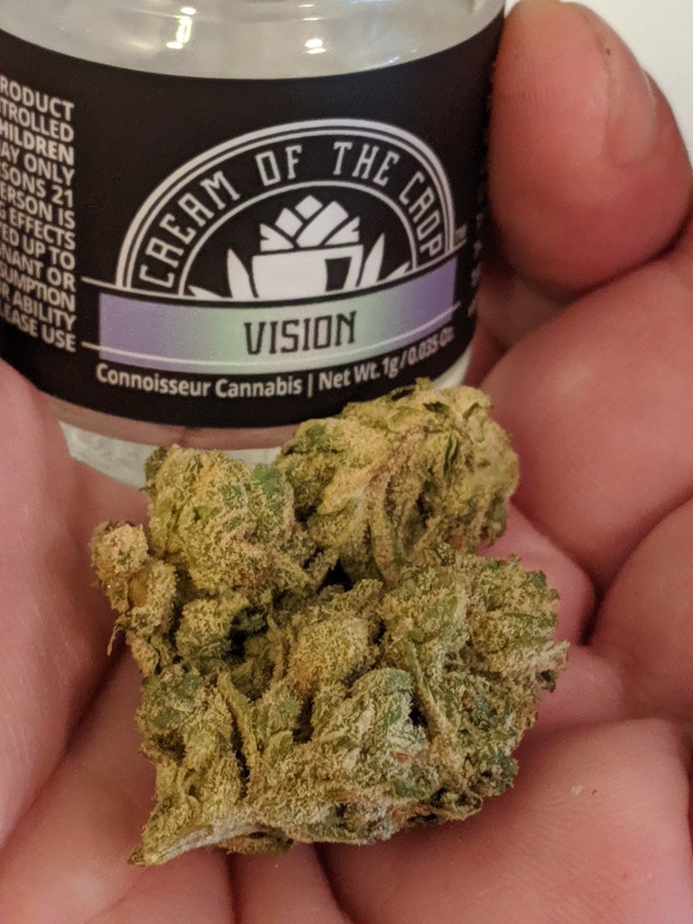 The nose out of the jar has a very pleasant natural sweetness that comes off like some hipster artisanal candy made of all natural ingredients using recipes from the 1850’s. There’s a faint fresh mustiness underneath, but it’s mostly dominated by a gentle fruit with minor anise like vibes. Busting open a nug, an even softer fruity sweetness emerges that hits me like a mix of red delicious apples and your standard cavendish banana all rolled into one, with a distant fresh backing. Breaking it down by hand it leaves a mint pine freshness on the fingertips, while the grinds themselves are very similar to the jar scent, having a sweet yet subdued fruitiness with a mint pine backend and a musty undertone. The dry pull on the j has that subtle sweet fruit in spades. There’s a very natural tasting banana candy that really comes through. The inhale is smooth on the bong and hit with a very quick fruity burst that bounced off the tongue, and while the joint had a nice musty sweetness with a fruit twist, over the course of the sesh it got a tad bit harsh. While it wasn’t anything unmanageable it should be noted. The exhale on the bong was a musty fruity sweetness, whereas the joint was more of a subtle sweet fruit with a minor freshness on the backend. Cross checking the flavors on my Ghost Vapes MV1, at 170c I get a slight cooling tingle on the way in and a very piney exhale, while at 185c it’s a strong sweet floral and pine. The headchange comes on with a quick slap that left me dazed and slack jawed near immediately. As I walked, I found myself with my head tilted upward staring up at the sky and admiring how blue it was on that particular day, as my mind happily wandered from thought to thought. Physically, I felt very light in the chest like my torso wanted to float upwards, while contradictorily my shoulders felt heavy like they were what was keeping me pinned to the earth. It’s a very classically blasted feeling, a sort of buzz that exhibits all the traits that you’d expect from being stoned, an old welcomed jazz standard form of being lit. While it may not be ideal for a wake and bake, I’d say it’s suitable for any time of day, and it doesn’t rock you so hard that you’re not able to focus and concentrate if need be. All and all I really enjoyed this batch of Bananalato, while it did have that harshness issue on the joint I dug how it smoked from the bong, and the smell/flavor experience was fairly unique despite it being born of two staple strains in today’s cannabis space. Depending on the ticket I’m able to find it at, I could see myself picking it up again but I’d be hesitant to roll another joint with it, although I’d happily pack bowls all day. Good work on this one Cream of the Crop! #bananalato #creamofthecrop #weshouldsmoke #okcool