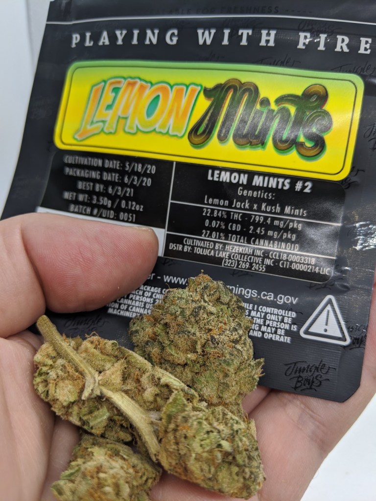 Lemon Mints #2 from The Jungle Boys via Jungle Boys OC on 6/17/2020. THC tested out to 22.84%. Purchased for $49 out the door. When Jungle Boys OC opened up I was stoked because I was hoping it meant that I could finally get their awesome low shelf zip deals without having to drive into LA. I popped into the shop one day only to find mid and top shelf bags available, and after the budtender pointed out the difference between the two was only a couple bucks, opted for these top shelf Lemon Mints. These beat up buds are a mix of dusty lime and forest greens with aubergine lilts, a smattering of reddish orange pistils, and a coating of yellowing triches that contribute further to it’s unkempt look.