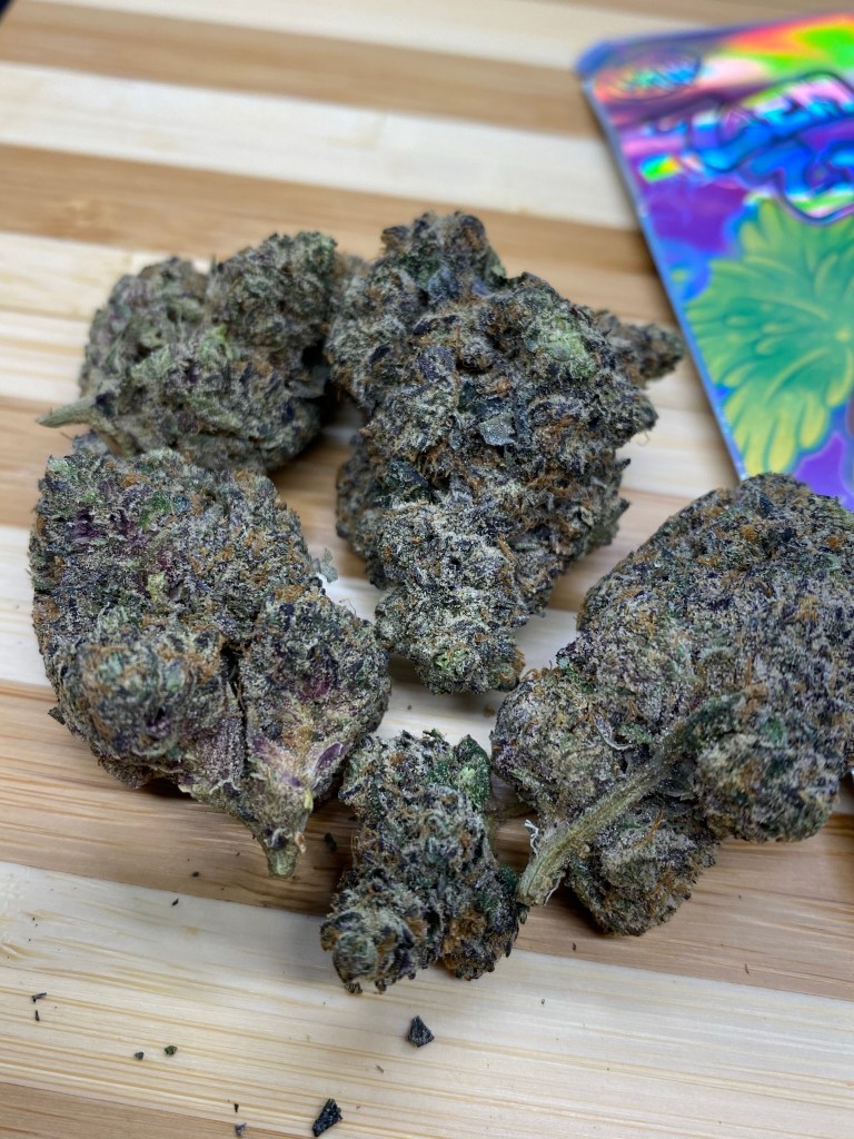 The aroma was enjoyable in a way that makes you want to go back to the jar over and over again, to revisit the delicious smell — a tropical fruit mixture, not over-ripe or rotten like the guavas or papayas, but fresh, with mostly citrus fruit notes and some exotic twist. There’s also this minty gas, like a nice sweet menthol, that gives this some artificial candy smell, so I can comfortably say this is one of those strains that smells like it’s named. When smoking, it does do a decent job of maintaining its taste. It’s not super strong, punch-you-in-the-face — it’s more the “terps under the smoke” type vibe. This smokes and burns really clean and damn near perfect, although I did receive it a slight bit wetter than my preference. Normally I’m cool with all that, but again, at this price point I’m being super picky. The other thing is, you taste the extra sugar leaf and it really adds un-enjoyable bitterness. Not overwhelming, but definitely there. I properly trimmed a nug and smoked the sugar leaf on its own, and then the bud on its own. First, no question that’s where the bitterness is coming from, and second, the sugar leaf by itself had quite a strong head change (and it was a clean enjoyable one) so I could see the argument for the trim based on that. The high on this one was pretty strong. It comes on reasonable at a good comfortable head change, that slowly transitions into a pretty strong euphoric high. This one really got my mind rushing and had me feeling a sort of buzzy head pressure (not uncomfortable but there). It eventually mellows into a fairly active high that, for me, made tackling some much-needed and physically-demanding yard work quite doable. For sure much more enjoyable of a job than it typically would be. Overall this is some very well grown weed, that you could argue needs a slightly better trim job. Not overwhelming in flavor, but solid. For me, an experienced smoker, it delivered a substantial and enjoyable high. It boasts some cool and really unique genetics that you can’t really get anywhere else. Plus there’s that little bit of pride from scoring elusive flowers that not everyone gets to smoke. If those boxes checked make it worth the ticket, I’d say grab it. Otherwise, you can find some flowers here and there that I would say smoke at similar quality, and often times with punchier terps, at a more reasonable ticket.