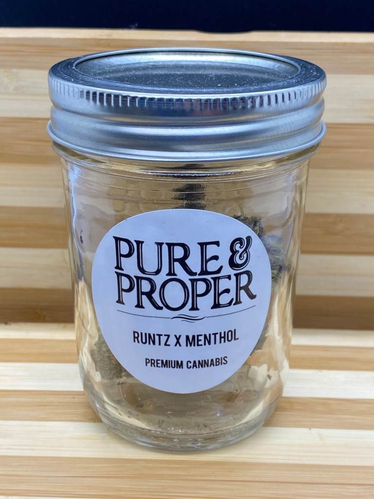 When smelling, I noticed a gas profile that turns to a menthol tingle in the nose with a deep inhale, which I really enjoy, and expected would translate when smoked. The terps were complex with this one. I picked up on a sweet, creamy gas and a slightly minty gas, that combine for an almost spiced gum drop smell. That happens to be one of my favorite candies, so I really enjoyed smelling this. When smoking, you taste more of the herbal component of the aroma and not much of the candy. There was a little bit of black licorice, and a little eucalyptus, with earthy/musty mint notes. Possibly a bit of a sweet finish, but slight and inconsistent. It’s still very enjoyable and burns super clean. Also, this has that nice lung expanding feeling I typically associate with a strong gas-profiled strain. The high was surprisingly strong, something I don’t typically associate with Runtz, so guessing that’s the Menthol influence (but not familiar with that strain so it’s just a guess). I felt it come on heavy behind my eyes, and a nice whole-body feeling of relaxation. I found it was fairly effective at easing pain and relaxing my stress. Soon I found myself just stuck going down rabbit holes on my phone, and a hour had quickly gone by. There aren’t a whole lot of cannabis strains that make me lose track of time and myself that way, and it’s such an enjoyable relaxing time (as long as it’s planned for, haha). So initially I was disappointed with this one, because with the crosses I was expecting a different flavor profile and it took me a little bit to get over that bias. But being past that, I can say this overall is a very flavorful, clean-smoking strain, that is highly effective at medicating me. I kept going back to stick my face in the jar and revisit the smell because I enjoyed it so much. I’m definitely looking forward to seeing what flavors pop next from Pure and Proper, and I will be watching and waiting to scoop some.