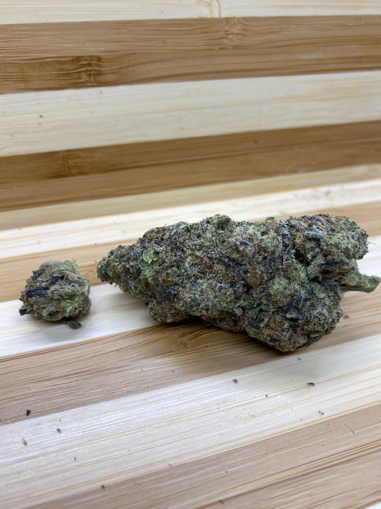 After trying the Zkittlez by Surefire selections I was eager to try more lucky for me @ftt had a few flavors including this ACMB. So this bag came as a 3.5g nug plus a .3 popcorn nug for a generous serving. The flower was dense and colorful reminded me of a splatter painting the way the purples, greens and speckled throughout a thick layer of trichomes with little strips of pistils the lined up like boundary lines on a map in a dark orange rust color. The structure of this bud was perfect and very easy to break apart and work with.